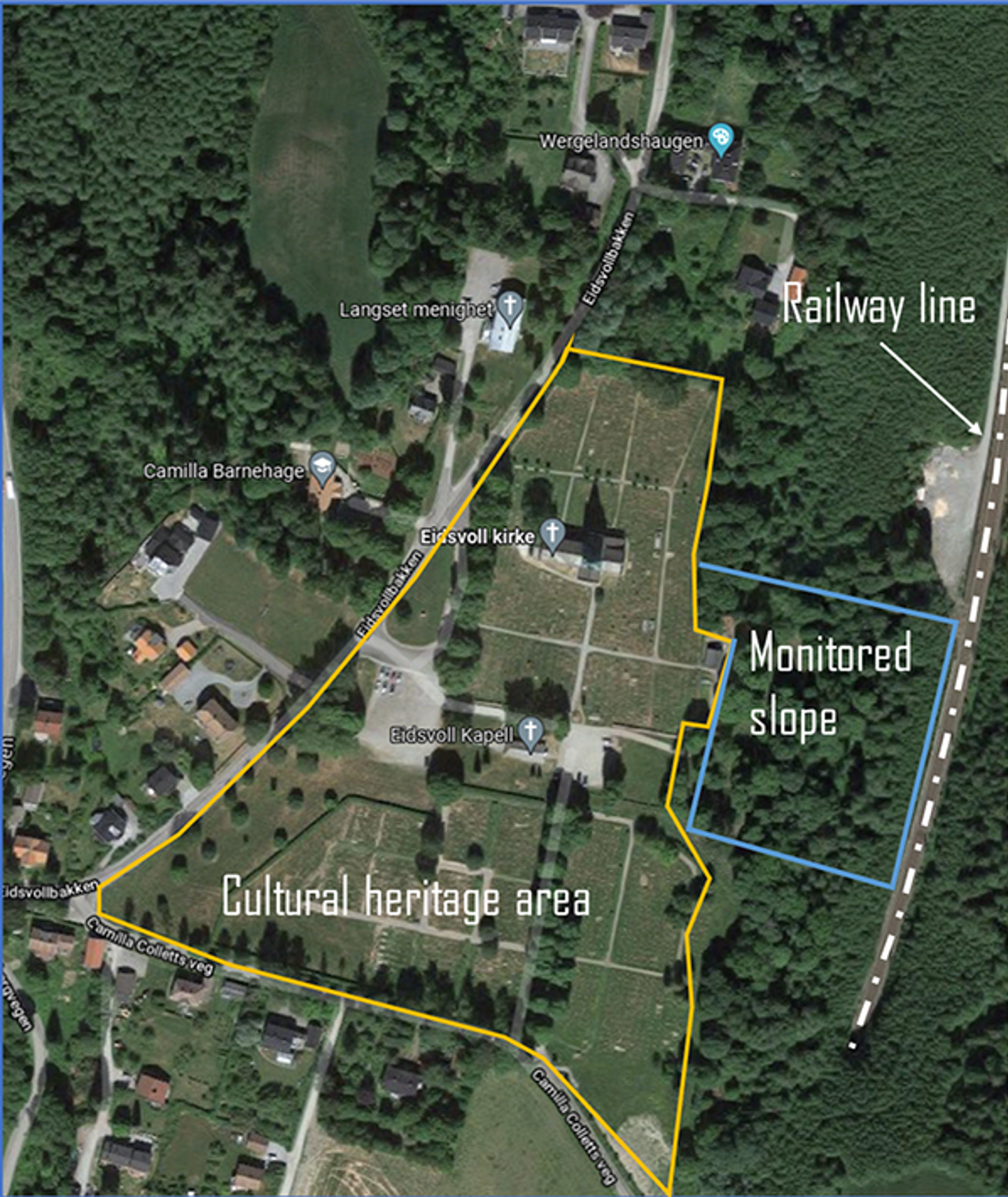 The case study site located in Eidsvoll, Viken county (Norway), consists of a steep unsaturated slope within a cultural heritage area, where an old church from the 12th century and its graveyard are located.