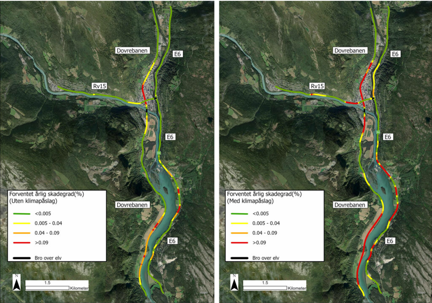 The direct annual costs of damage on the railway Dovrebanen, and the main roads E6 and Rv15 are estimated to NOK 1.087.239, NOK 604.071 and NOK 59.859, respectively, when accounting for climate change. By including the climate effect, the cost related to direct damages increased by 635% for E6, 899% for Rv15 and 507% for the railway Dovrebanen (Figure 1). Dovrebanen has the highest costs related to flooding in the study areas, however, the section of highest risk is located at E6 south of where the rivers merge. The applied damage functions used are not ideal for analysis requiring a high level of detail. The functions can be improved by considering the shape and construction of the infrastructure, as well as including more variables as durations and velocity.